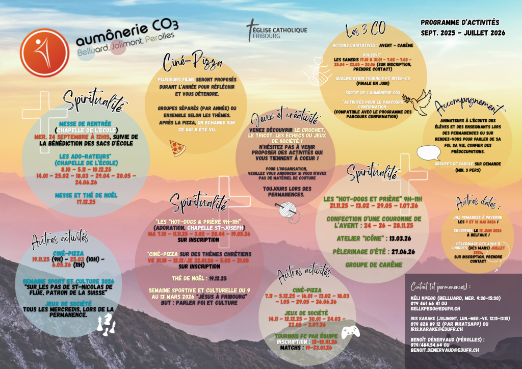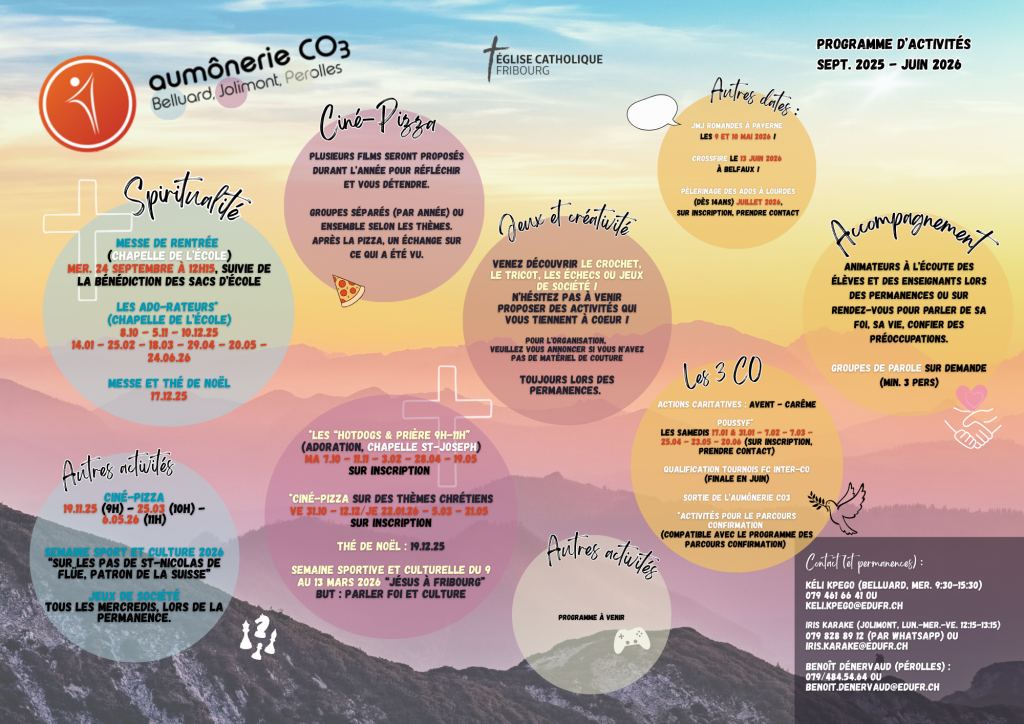 L’aumônerie des CO3 (Belluard/COBE, Jolimont/COJO, Pérolles/COPE) propose des activités toute l’année pour permettre aux élèves de se ressourcer entre les cours. Elles sont ouvertes à celles et ceux qui le désirent, indépendamment de l’appartenance religieuse.