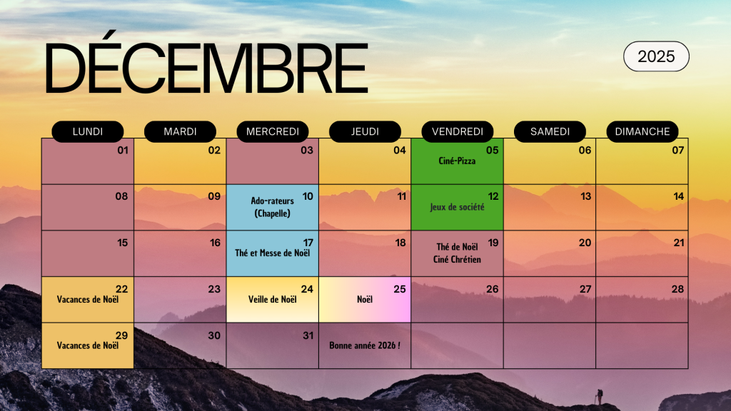 L’activité se déroule le samedi de 14h00 à 17h00: tu recevras tous les détails par Teams une fois inscrit(e) (à l’aide du bulletin de ton aumônerie), et si tu as des questions, n’hésite pas à les poser !