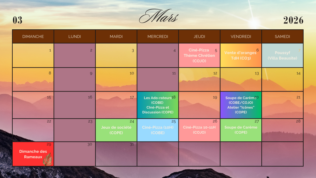 L’activité se déroule le samedi de 14h00 à 17h00: tu recevras tous les détails par Teams une fois inscrit(e) (à l’aide du bulletin de ton aumônerie), et si tu as des questions, n’hésite pas à les poser !