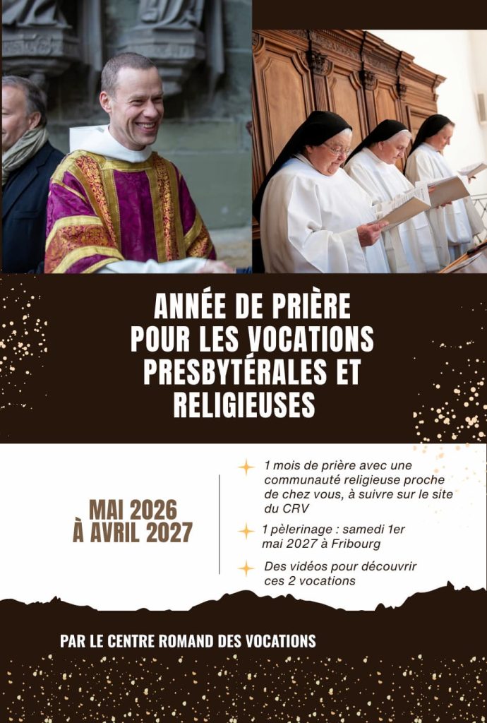 Le Centre romand des vocations (CRV) a lancé le 26 avril 2026, dimanche des vocations, une «année de prière pour les vocations presbytérales et religieuses». Des vidéos et activités sur ce thème seront proposées au fil des douze prochains mois.
